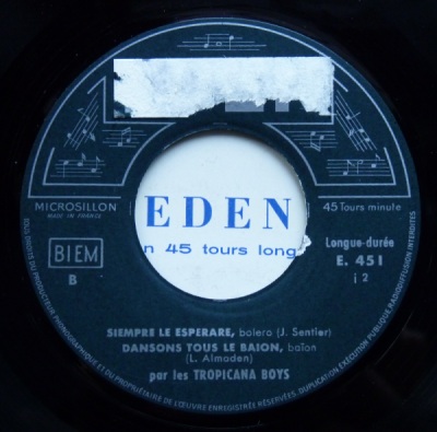 Releases with low catalogue numbers in the Miami series are often labelled Eden. It is likely the label name was originally Eden and then soon changed to Miami. This copy of E. 451 Tropicana Boys n°1 has paper pasted over the Eden label name on the disc labels. Perhaps this paper said Miami. Click the below picture for an enlarged view: