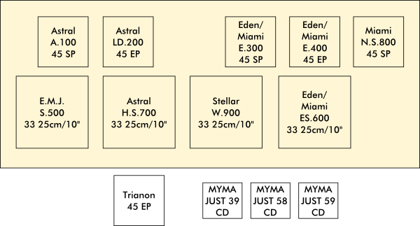 The Astral and Miami EPs (LD 2xx and E. 4xx) are the longest running series, each with about 40 discs. They both have themed releases by artists, and compilation series of about 12 discs, Musique Dans Le Vent on Astral and Cocktail Musical on Miami. Much of this music is found on the Stellar 25cm Dancing Selection discs.